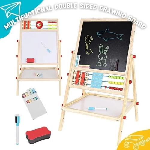 تحتوي السبورة على أدوات تعليمية مدمجة تشمل ساعة تعليمية ملونة لتعليم قراءة الوقت، بولير خشبي ملون لتعلم العد والرياضيات الأساسية، ورف لتخزين الطباشير والأقلام والممحاة والحروف المغناطيسية. تصميمها القابل للطي يجعلها سهلة التخزين والحمل، بينما تشجع الأطفال على الاستكشاف والتعلم من خلال اللعب التفاعلي.